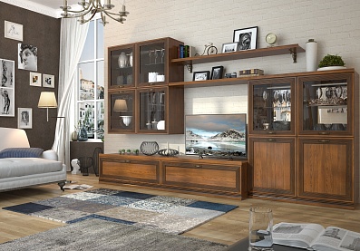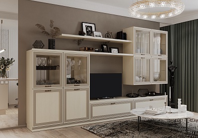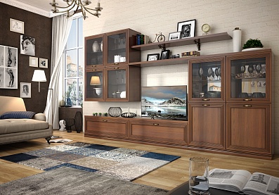Классические стенки в гостиную создают гармоничную и изысканную атмосферу, добавляют элегантности, подчеркивают хороший вкус хозяев. Современная стенка в классическом стиле для гостиной отличается вместительностью и функциональностью. Внутри без труда помещаются габаритные вещи. В стеклянных шкафах отлично смотрятся предметы декора, красивая посуда.