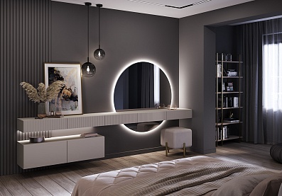 - Каждая секция с двумя отделениями по вертикали, в нижнем отделении два выдвижного ящика, верхнее отделение — открытая ниша;
