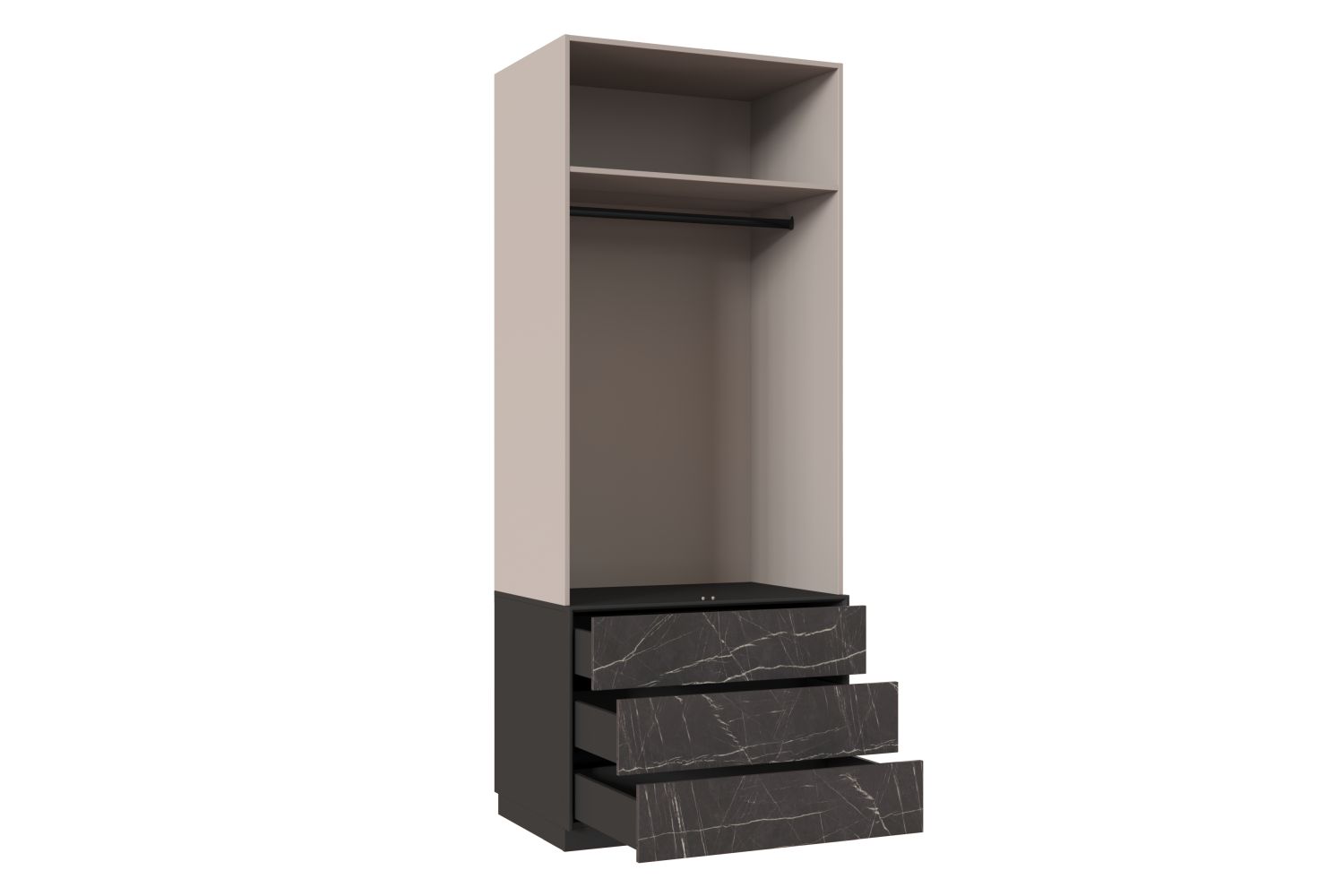 Все модули гармонично сочетаются друг с другом. Черный акцентный мрамор добавляет коллекции изысканности и роскоши, а выразительная геометрия тонких черных ручек на фасадах, перетекающая в линию опор, придают ей современный вид.